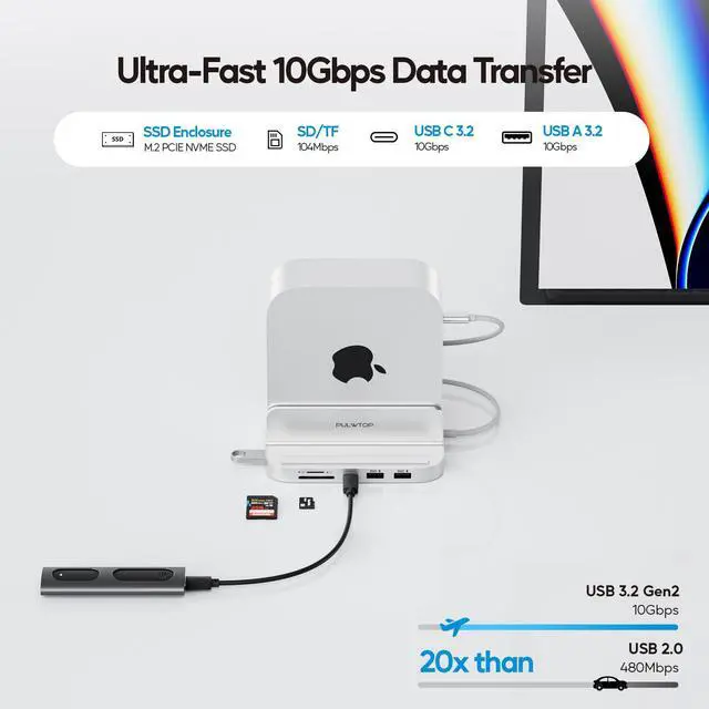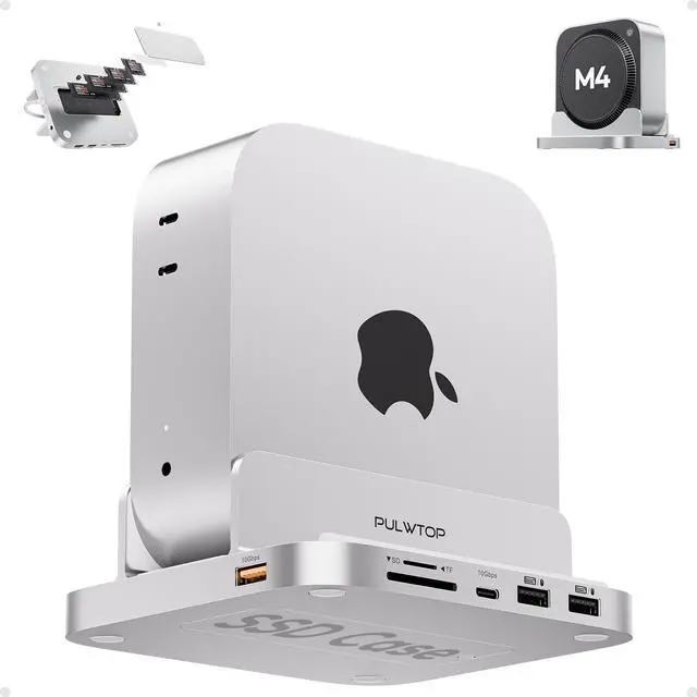 (2) UP TO 4TB M. 2 SSD EXPANSION - PULWTOP Mac Mini M4 Pro Hub supports up to 10Gbps M. 2 PCIe NVMe SSD expansion. The SSD enclosure of Mac Mini 2024 dock is compatible with NVMe protocol (B+M Key/ M Key) SSDs in sizes of 2230/ 2242/ 2260/ 2280 and up to 4TB expansion.