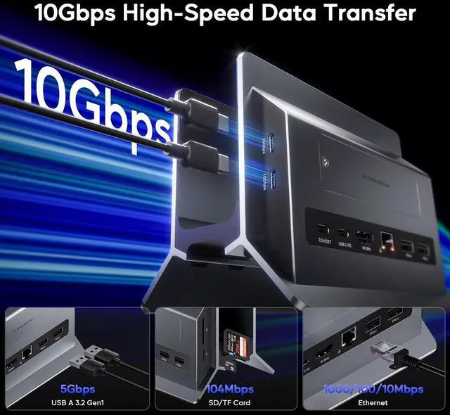 (1) 11 IN 1 LAPTOP DOCKING STATION - This macbook docking station is designed with a 4K@60Hz HDMI, 2 x USB A 3.0 5Gbps, 2 x USB C 3.2 10Gbps, 10Gbps M. 2 NVMe SSD expansion slot, USB C to host, USB C PD in 100W Charge port, SD/ TF card reader, RJ45 Ethernet port (10/100/1000Mbps).