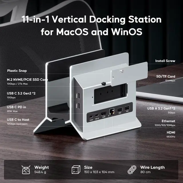 NOTE: SSD NOT included. Our vertical laptop docking station supports SSD expansion up to 2TB and transfer speed up to 10Gbps. Compatible with PCIe NVMe M. 2 SSDs in sizes of 2230/ 2242/ 2260/ 2280. Easy to expand the external hard drive to meet the insufficient storage needs of Mac Mini, Macbook and other USB-C laptops.
