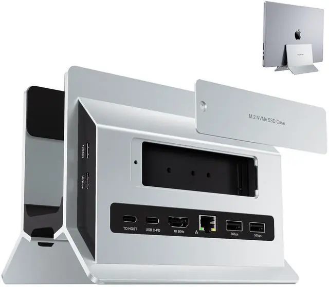 NOTE: NOT compatible with Mac Mini M4/M4 Pro 2024. Not only meet the needs of memory expansion and comprehensive connectivity, this macbook docking station stand with SSD enclosure also can be used as a laptop stand, allowing you to place your laptop horizontally or vertically on the desk, space-saving and keep your work desk tidy. Compatible with Macbook M1/M2/M3/M4, MacBook Air, Mac Mini, MacBook Pro, laptops with USB-C port that supports functions of data transmission, video and charging