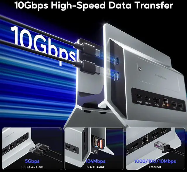 (4) UP TO 10Gbps FAST DATA TRANSFER - This MacBook Pro dock is equipped with 2 USB C 3.2 10Gbps ports and 2 USB A 3.0 5Gbps ports to transfer large files in seconds. The SD/TF card slots (480Mbps) support reading and writting 2 cards simultaneously.