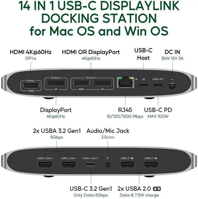 (2) MULTIPORT DISPLAYLINK DOCKING FOR EXTENSIVE CONNECTIVITY: The DisplayLink docking station provides 14 ports in total. Includes 1 x 4K@60Hz HDMI/DP 1.4 ("Display 1"); 1 x 4K@60Hz Displayport ("Display 2"); 1 x 4K@60Hz HDMI or 1 x Displayport ("Display 3", pick 1 of HDMI and DP); 2 x USB A 3.2 Gen1 port( 5Gbps, ONLY data); 2 x USBA 2.0 ports (data & charge); 1 x USB C 3.2 Gen1 port (5Gbps, ONLY data); 1 x USB-C PD charging port (Max 100W); 1 x USB C to Host; 1 x DC-in port; 1 x Gigabit Ethernet and 1 x 3.5 mm Audio/Mic jack.