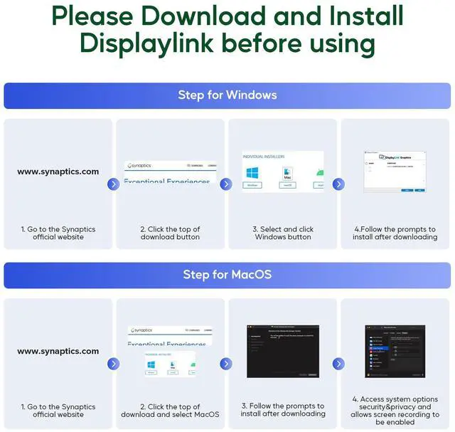 (3) 4K TRIPLE DISPLAY EXTENSION FOR LAPTOPS WITH USB C PORT: After installing the DisplayLink driver, our USB C docking station with displayport could help to achieve triple monitor display. HDMI ("Display 1") + ("Display 2") + HDMI or DP ("Display 3") that all displays could reach 3 x 4K@60Hz(under DP 1.4 ). Mirror mode and extend mode for Macbook could be chosen based on your needs. (Support both SST & MST).