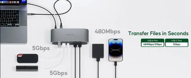 (5) ULTRA-SPEED DATA TRANSFER & FAST CHARGING: The USB displaylink docking station features 2 x 5 Gbps USB A 3.2 Gen1 ports and 1 x 5Gbps USB-C 3.2 Gen1 port (USBA/C ports only support data transfer), which support transferring 1 GB files in seconds. The USB-C PD port of our laptop dock for dual monitor could charge your laptop up to 100W. The 2 x USB A 2.0 ports of the laptop displaylink dock not only support keyboard and mouse, but also provide 7.5W power to charge your mobile phone or other devices.