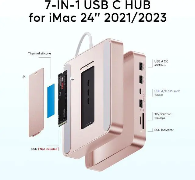 • Multifunctional 7-IN-1 USB Adapter designed for imac: Docking Station supports 1 USB C 3.2 Gen2 10Gbps, 1 USB A 3.2 10Gbps, 2 USB A 2.0 480Mbps, SD/TF card reader, and 1 M.2 NVMe. While expanding the function, expand a super-large (2TB) external hard disk for your imac, which greatly expands your imac storage. (External SSD needs to be purchased separately)