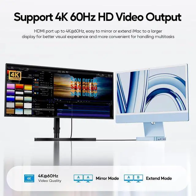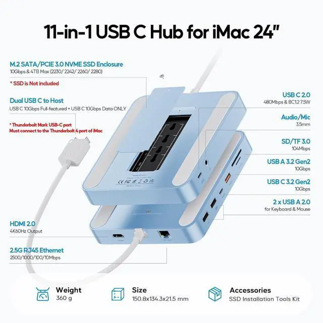 11-IN-1 USB C HUB DESIGNED FOR IMAC 24 INCH - Custom-designed for iMac 24 inch 2021/2023/2024, both an iMac dock stand and an iMac hub docking station. As a functional imac 24 inch accessories, this imac hub features a 4K 60Hz HDMI, M.2 SSD enclosure, 2.5G ethernet, USB C 3.2 Gen2 10Gbps, USB A 3.2 Gen2 10Gbps, USB C 2.0 with BC1.2 7.5W charging, 2 x USB A 2.0, SD/TF card reader, 3.5mm audio/mic jack, providing comprehensive connectivity and powerful productivity for your iMac