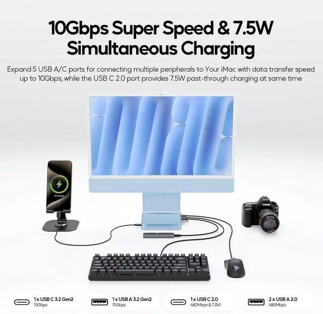 UP TO 10GBPS SUPER SPEED & 7.5W SIMULTANEOUS CHARGING - The imac multiport adapter features with 10Gbps USB-A/C 3.2 Gen2 data ports that support read and write speed up to 1000-1200MB/s, transmiting 1G large files in seconds. Connect your phone or other USB-C device to the 7.5W USB C 2.0 data port to get simultaneous charging. 2 x USB A 2.0 ports, 3.5mm audio/mic jack and SD/Micro SD card readers for seamlessly access to mouse, keyboard, and other essential peripherals at once