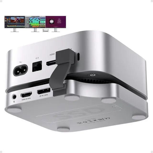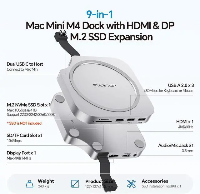 USB C HUB FOR MAC MINI M4 - Custom-designed for Mac Mini M4, both a Mac Mini M4 2024 mount and a USB-C dock with an up to 4TB M.2 SSD external hard drive expansion slot. The mac mini m4 hub also features a 4K 60Hz HDMI, 4K 60Hz DP, 3 x USB-A 2.0 data ports (Max 480Mbps) for mouse and keyboard, SD/Micro SD Card slots (104 Mbps), a 3.5mm audio/mic jack for convenient access to the essential peripherals and achieve memory expansion