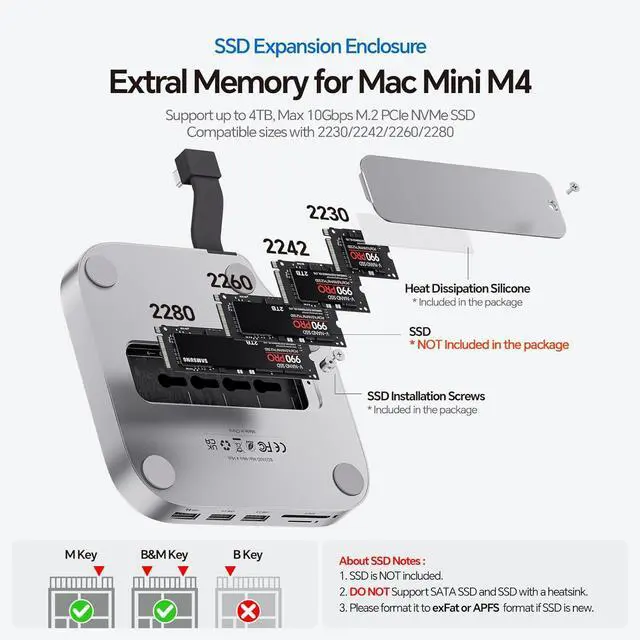 SUPPORTS M.2 SSD EXPANSION - The Mac Mini M4 2024 hub stand supports up to 4TB/10Gbps M.2 PCIe NVMe external hard drive expansion, perfect for the mac mini m4 users who needing additional storage without compromising speed or efficiency. Support PCIe M.2 SSDs in size of 2242/2260/2280. NOTE: 1). SSD is NOT included; 2). DOES NOT support SATA SSDs; 3) Please initialize the new SSD because SSDs must be formatted to work with host in order for SSD to mount and show up; 4) Please format your new SSD into "exFat" or "apfs " format