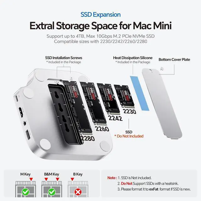 Effortless M.2 SSD ExpansionThis Mac Mini Docking Station is with an SSD enclosure that supports up to 4TB/10Gbps M.2 NVME SSDs (SATA is not supported )and is compatible with SSD sizes (2230/2242/2260/2280). NOTE: SSD is not included) If your SSD is new, please format your NEW SSD into "exFat" or "apfs" format.