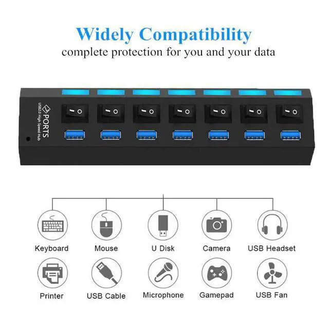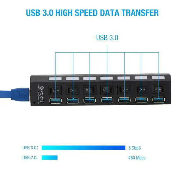 Description: SuperSpeed USB 3.0 ports to your computer with this 7-port hub Each port has an individual power switch and a blue LED power indicator This bus powered hub will support up to 500mA of current 7-Port SuperSpeed USB 3.0 Hub supports data transfer rates of up to 5Gbps Plug and play. No drivers needed. Compatible with Windows, Mac, and Linux Each port has a power switch and LED power indicator Voltage and current overload protection will protect the hub and connected devices Detachable tangle-free 1.5 foot USB 3.0 cable Size: 6.4"x 1.3 " x 0.76 " Weight: 32g Features: Type: 7 Ports USB 3.0 USB Hub Material: ABS Color: Black Indicator: Yes Port Number: 7 Interface: USB 3.0 Transmission Rate: 5Gbps Powered by: AC charger, USB Bus-power limit current protection: 500mA System requirements: Windows XP / Vista /7/8/10, Mac OS (10.X or above) Package Include: 1 x 7 port USB 3.0 hub 1 x USB 3.0 cable