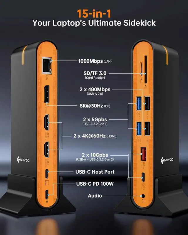 DESIGNED FOR MODERN PROFESSIONALS Tailored for developers, designers, and remote workers, the NOVOO RM15D docking station addresses limited laptop ports, cluttered workspaces, and the need for high-performance multi-monitor setups as an excellet multiple HDMI adapter.