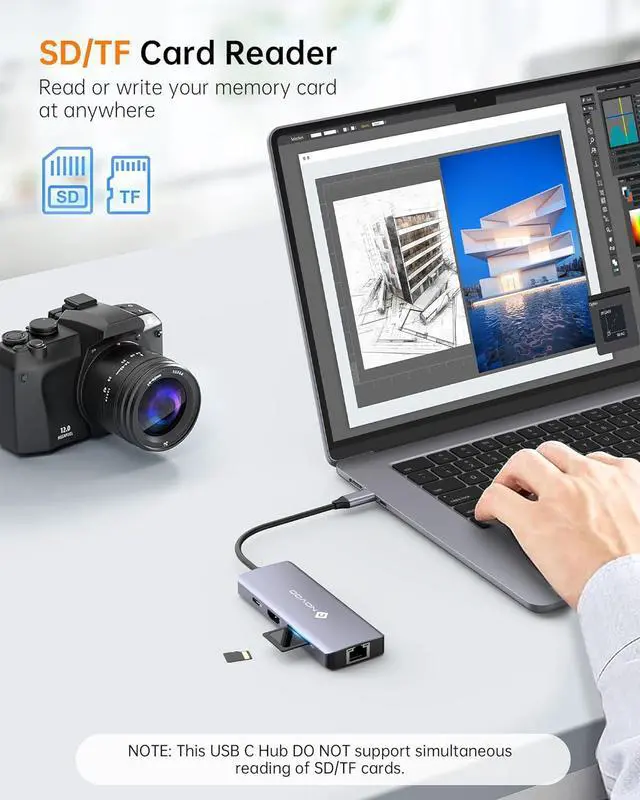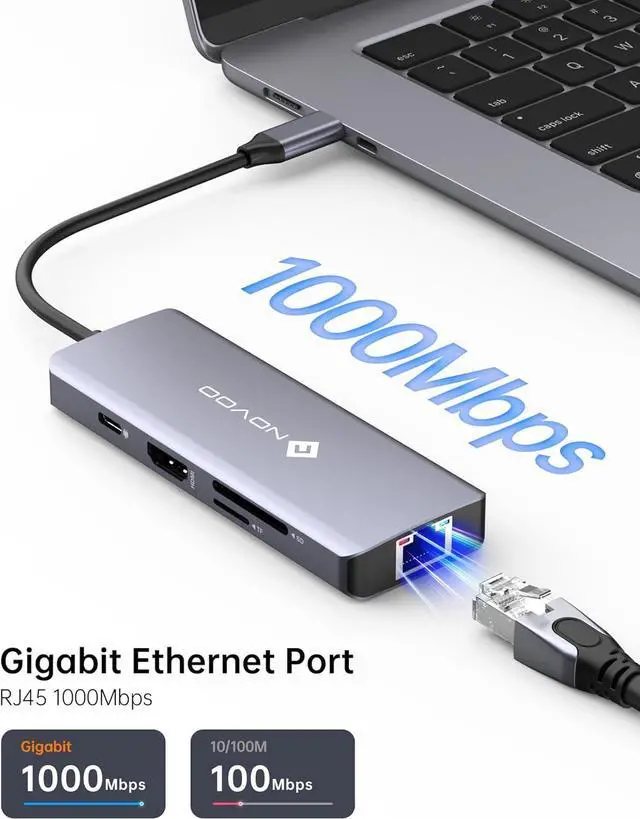 USB C Hub Multiport Adapter 8 in 1 - Instant ExpansionNOVOO USB C Hub provides all the ports you need for seamless connection. 1*4K@60Hz HDMI port,1*100W USB-C PD port, 1*5Gbps USB-C data port, 2* 5Gbps USB-A data ports,1* 1000Mbps Ethernet, and SD/TF card slot. All hub ports can work at the same time, which can meet all your expansion needs at the same time, small but powerful.