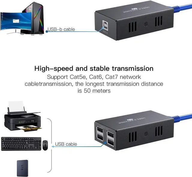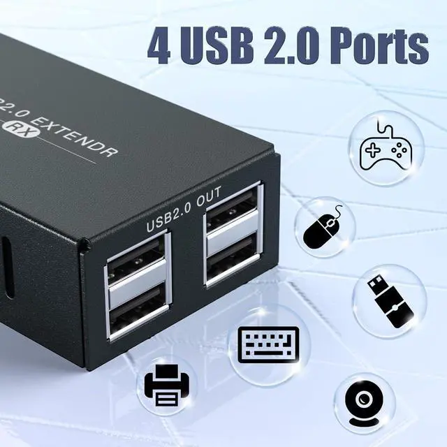 4 USB 2.0 HubsWith four USB 2.0 hub ports, this USB extender provides a comprehensive solution for connecting a wide range of USB devices. Whether it's a printer, external hard drive, network camera, keyboard, mouse, or other peripherals, you can seamlessly manage multiple devices.