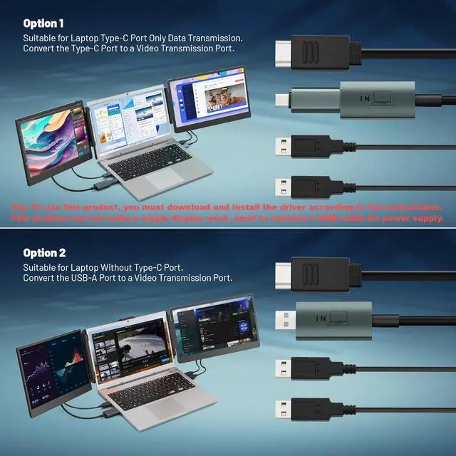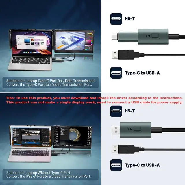 The H5-T computer cable adapter converts the normal USB-A/Type port of your laptop into a port for video transmission. Perfect for your laptop's compatibility with the S1/S2/S3 laptop screen extender.