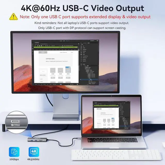 USB-C EXTENDED DISPLAY: Only one USB-C DisplayPort supports 4K@60Hz display and 10Gbps data transfer, offering seamless extended monitor functionality and high-speed video transmission without needing HDMI interfaces.