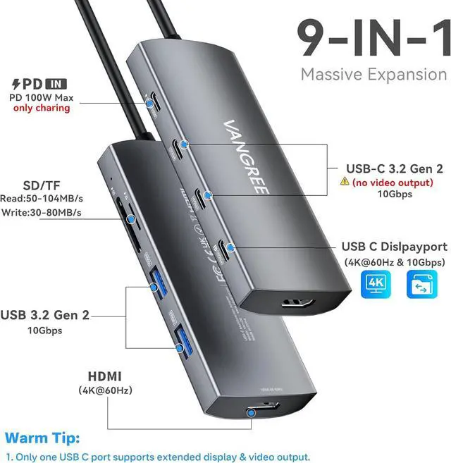 9-IN-1 USB C VIDEO OUTPUT HUB: This USB C Hub expands one type-c port to 2*USB-C 3.2 10Gbps ports, 2*USB-A 3.2 10Gbps ports, USB-C DisplayPort (4K@60Hz & 10Gbps data transfer), 100W power delivery port, 4K@60Hz HDMI port, SD/TF card reader.