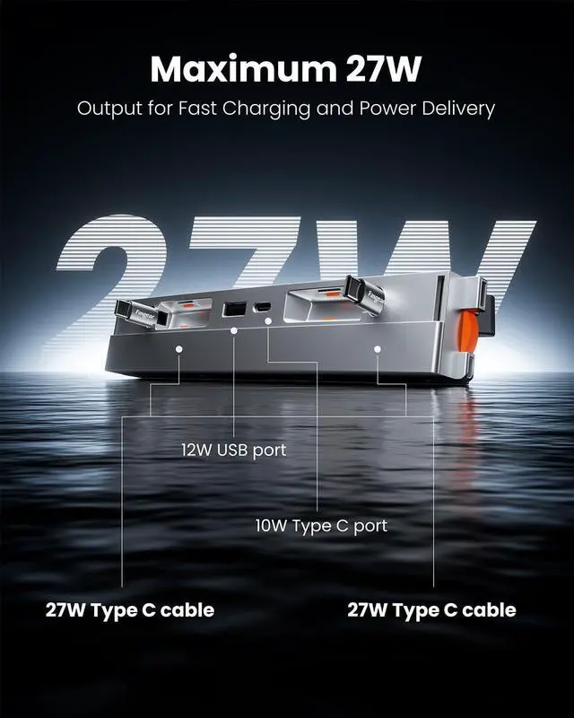 Maximum 27W Output for Fast ChargingOur Tesla Model 3 2024 and New Model Y 2025 accessories USB hub has 4 ports: 2 Pack 27W USB C cable, a 12W USB port and a 10W type-C port. Support Power delivery and Fast Charging. Thus, our car hub can work with smartphones/ tablets/ switches/Blue-tooth earbuds, and so on. Note: 1. The max current of the dual USB C port and USB port is 3A. 2. You should plug in the cigarette lighter and connect the power. 3. Don't support data transfer.