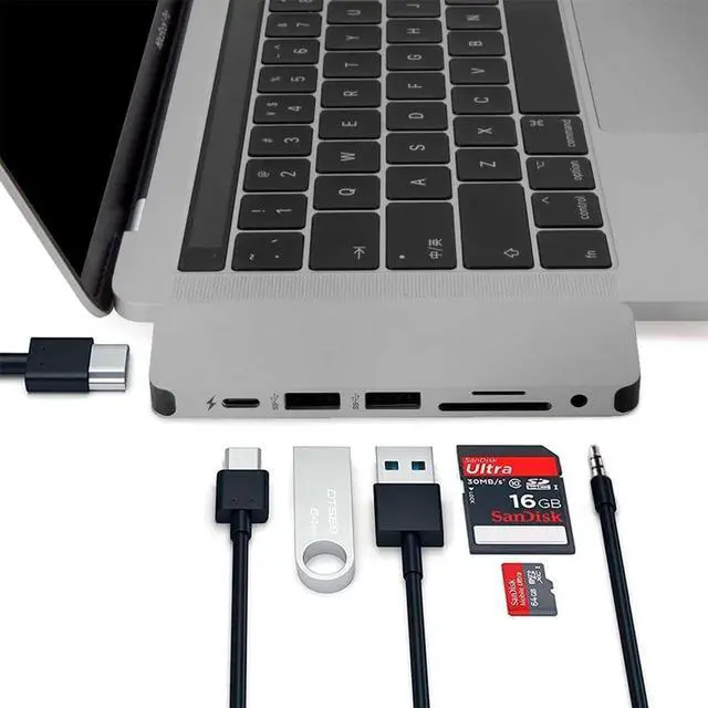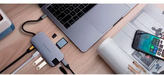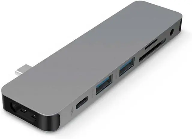 Turns a single USB-C port into 7 ports (HDMI, USB-C with Power Delivery, 2 x USB 3.1, micros, SD, audio jack)