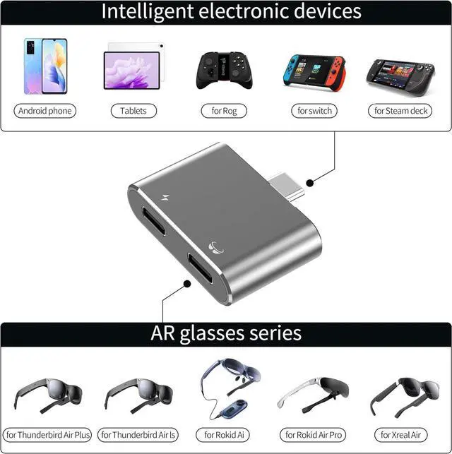 Video And Charging 2-in-1: This charging port is compatible(Note: It's compatibility not enhancement, you need to have a charger with the corresponding charging power) with 65W/100W USB-C fast charger that used in this hub allows the phone & gaming hendhleds to charge quickly. Newly upgraded customized chip with stable video transmission and better compatibility(Note: It's compatibility not enhancement, your device needs to have such high performance), Up to 4K@60Hz 1080P@120Hz, for Switch, Smart Phone, Steam Deck (Not compatible with Switch 2). Also suitable for Rokid, Xreal (Nreal) Ari, Thunderbird Ari series AR glasses, etc.