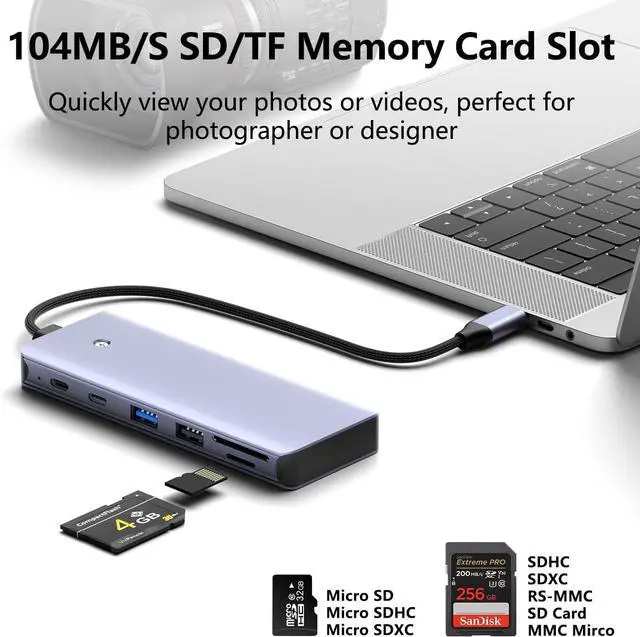 USB 3.1 Gen2 Ports with 10Gbps & SD/TF Card ReaderFeatures 3.1 Gen2 port up to 10Gbps, 10Gbps high speed USB ports transfer 10x faster than USB 2.0, which allows you to transfer HD movies or files in just seconds. SD/TF Card Reader can be used at a fast transfer speed up to 104M/s, easy to transfer photos shooting or videos by your camera from cards to laptop in just seconds. Plug and Play, No Software, Drivers Required.