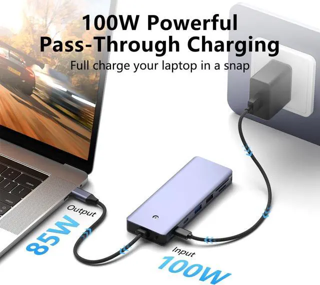 100W Power Delivery100W power delivery charging port allows you to charge your computer, ideal for MacBook Pro/Air or and other USB C devices, your primary choice of USB C Hub. Plug and Play, No Software, Drivers Required. Features USB Type-C port up to 10Gbps, 10Gbps high speed USB ports transfer 5x faster than USB 2.0, which allows you to transfer HD movies or files in just seconds.