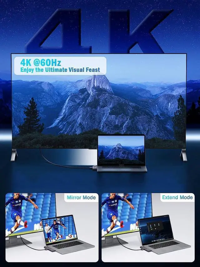 4K HDMI 60Hz PortHDMI provides 4K UHD video output, allows easily streaming media to a larger monitor or television in stunning 4K, making every second of the video counts. Mirror or extend your screen with Mac USB C hub Adapter's HDMI port and directly stream 4K UHD @60Hz or Full HD 1080p video to HDTV, monitor or projector.