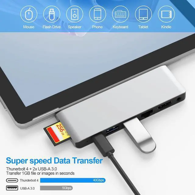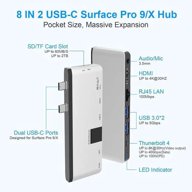 Docking Station for Surface Pro 9/Pro XSpecifically developed for Microsoft Surface Pro 9/Pro X, which turns the 2 USB-C connection into 8 ports 1X 4K HDMI, 1X Thunderbolt 4 USB C port (8K@30Hz Video Display + 40Gbps Data Transfer + 100W PD Charging), 1X 100Mbps RJ45 Ethernet, 2 X USB 3.0 ports, 1X SD card reader slot, 1X TF card reader slot1X 3.5mm Audio PortJust plug and play, no driver needed, While aluminum case protect the shape and easily release heat. Note: This Surface pro 9 usb hub won't fit your Surface Pro 9/Pro X very well if you use an protective case .