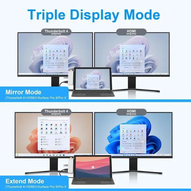 Triple Display Mode Surface Pro 9 Docking StationTriple display ( 4K HDMI + USB-C Thunderbolt 4 ) + Surface Pro 9 modes Boost your efficiency 3 times. This Surface Pro 9 hub allows you to extend 2 monitors which provide more space for work and you can do different project on different monitors. Support Extend Or Mirror Mode, HDMI Resolution up to 4K@30Hz, USB-C Thunderbolt 4 resolution up to 8K@30Hz; An ideal Gadget for Video Editor, Photography, Programmer.
