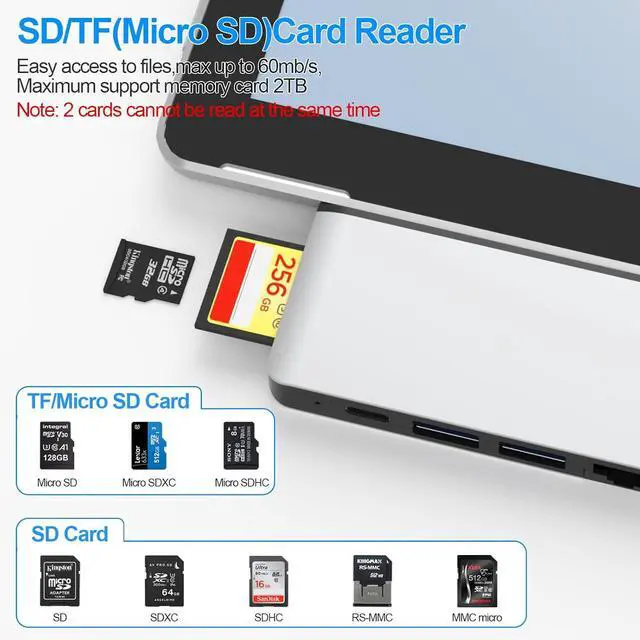 Surface Pro 9 Adapter with High Speed Data TransferType C Thunderbolt 4 supports 40Gbps data transmission, USB 3.0 port up to 5Gbps transfer. The built-in SD/TF (Micro SD) slot allows for easy access to files from SD/TF memory cards with a super speed of up to 480Mbps. Compatible with SDXC, SDHC, SD, MMC, RS-MMC, TF, Micro-SDXC, Micro-SD, Micro-SDHC, Mini-SD and UHS-I cards up to 2TB, allows you to transfer photos, videos, music and files quickly. Note:SD,TF cards cant be read at the same time.