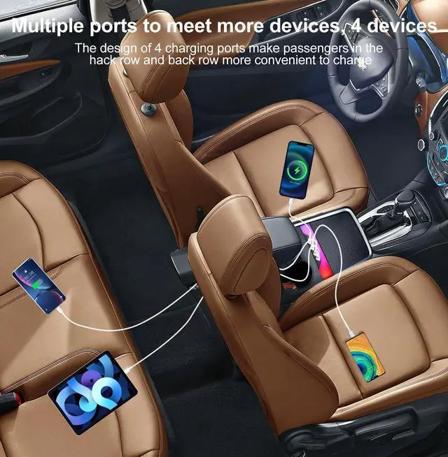 Multi Ports: Equipped with 4 USB ports (2 USB-A and 2 USB-C), it can power multiple devices (e.g., cell phones, tablets, etc.), will meets the charging needs of the passenger and back seat. It also supports data transfer from U disksdisks