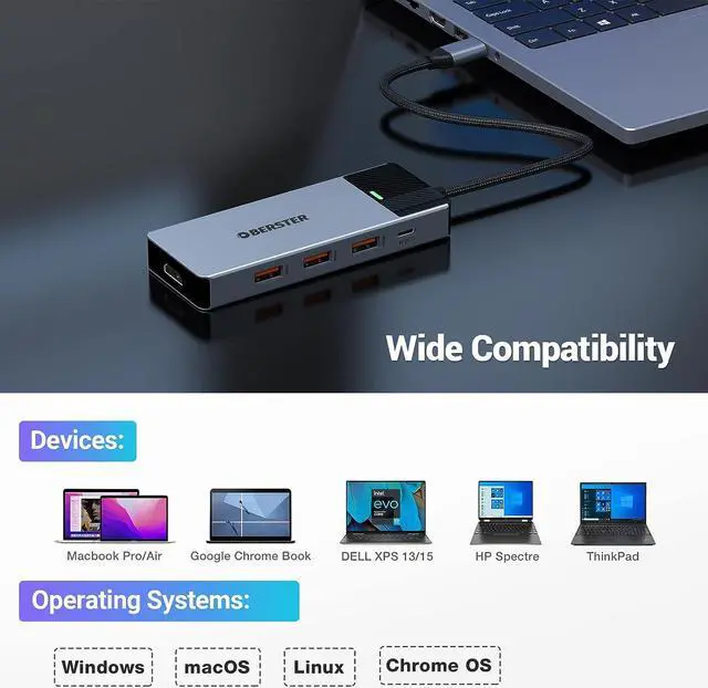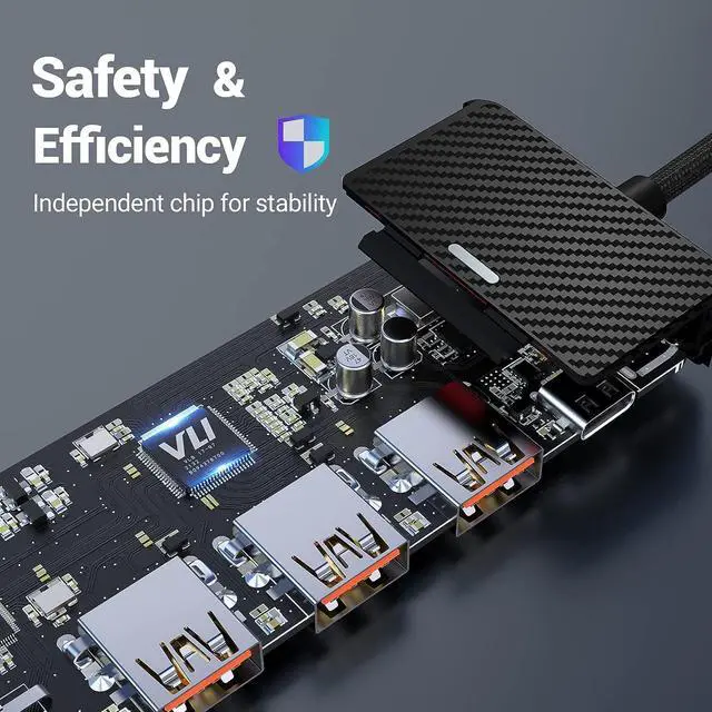 Full Function Type-C Port-- The USB C port on the data hub support both data transfering and PD charging. Convenient for your type c device to transfer files up to 10 Gbps. When your laptop need to be charged, this port can also be used as 100W PD port, significantly shortening charging times. The Built-in smart chip of USB C extender can prevent overload, short circuit, overcharge, overtemperature, keeping your device safe and effectively work.