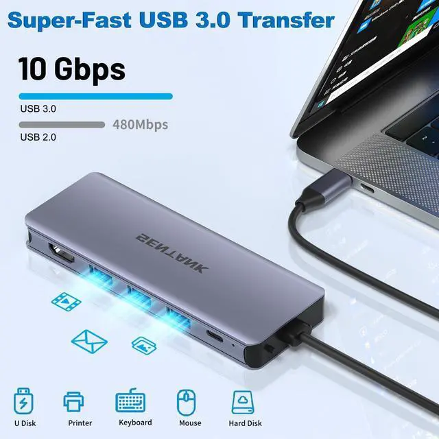 Blazing-Fast Data Transfer & 4K@60Hz Ultra-High DefinitionExperience lightning-fast data transfer speeds of up to 10Gbps with the USB 3.0 ports, ideal for transferring large files in seconds. No longer need to worry about the problem of insufficient USB ports, which can bring great convenience to your life and work. Enjoy crystal-clear visuals with the 4K@60Hz HDMI port, perfect for streaming, presentations, or immersive gaming experiences.