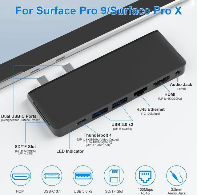 [Designed for Surface Pro 9/X] Docking Station specifically designed for Microsoft Surface Pro 9 and Pro X with multiple ports, including USB-C Thunderbolt 4(8K@30Hz Video Display + 40Gbps Data Transfer + 100W Charging), HDMI, 100M RJ45 Ethernet, USB 3.0, SD card slot, TF card slot, 3.5mm Audio, our docking station makes it easy to connect all your accessories.Just plug and play, no driver needed. Note:The Surface Pro 9 docking station won't fit your Surface Pro 9 perfectly if you use an protect