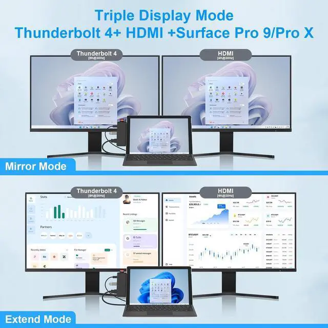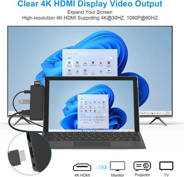 [HD Video Triple Display] Surface pro 9 accessories can extend 2 monitors, support 4K@30Hz HDMI interface+ 8K@30Hz USB-C Thunerbolt 4 interface+Surface Pro 9/Suface Pro X display which provide more space for work and you can do different project on different monitors. Support Extend Or Mirror Mode, HDMI Resolution up to 4K@30Hz, USB-C Thunerbolt 4 resolution up to 8K@30Hz.