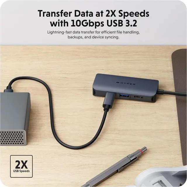 Extended 4K60Hz Monitor Support for Mac, PC, and Chromebook: Enhance your productivity and multitasking capabilities with Hyper's travel accessories. By providing a spacious and immersive workspace, this USB-C hub allows users to simultaneously view and work on multiple high-resolution content, such as videos, images, documents, and applications, with smooth and crisp visuals.