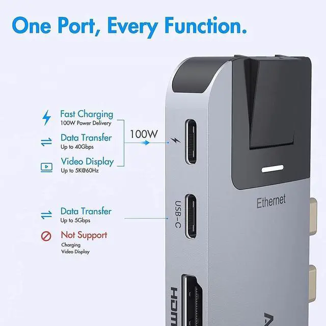 Dual USB C Female Port: The first usb-c port is a original thunderbolt 3 port like the macbook itself which support data transfer up to 40Gb/s, up to 5K displays and up to 100W power; Another usbc port is a data transfer port which speed can up to 5Gbps, a best port for USB C Device like ssd hdd,etc. Notice: The second usb c port of this usb c hub doesn't support HDMI output and charging function.