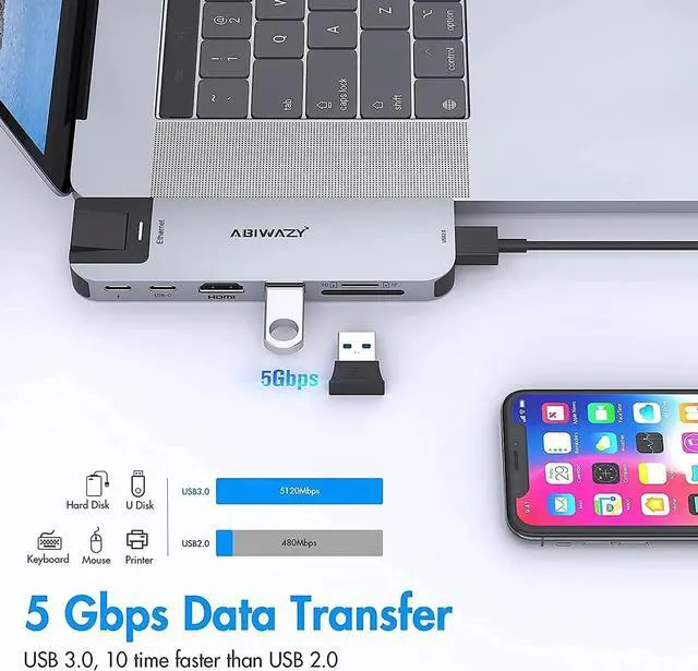 Dual SuperSpeed USB 3.0 Ports: This MacBook pro usb adapter comes with two usb 3.0 ports which transfer speed can up to 5Gbps, your can connect usb keyboard, mouse, usb driver, usb hard disks to your laptop easily via this macbook air adapter. Notice: this is macbook pro dongle only allow connect 1 HDD/SSD at the same time.