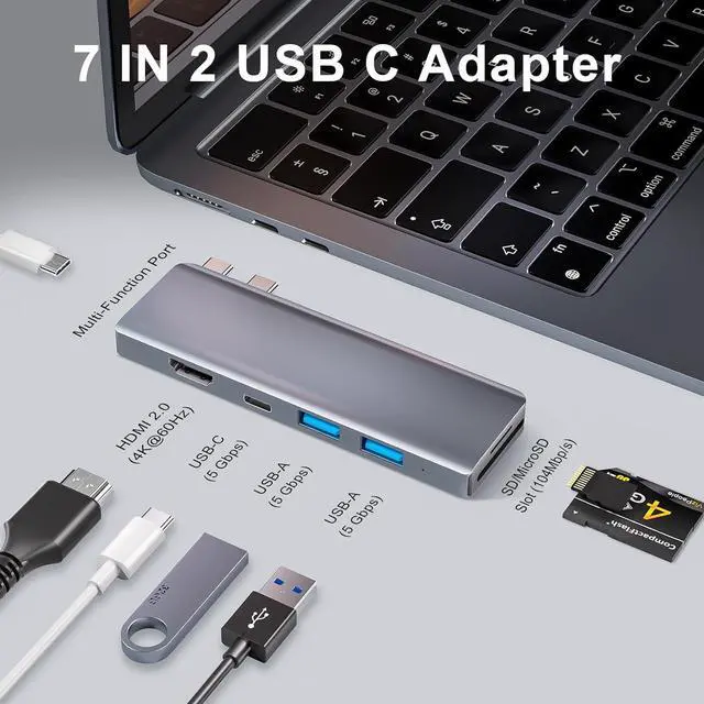 7-in-2 Massive Expansion All Essential Ports:Transform your MacBooks dual USB-C ports into 7 versatile ports: 1*Thunderbolt 4 (100W PD charging, 40Gbps data transfer, 5K@60Hz video output), 1*HDMI 4K@60Hz, 1*USB-C & 2* USB-A 3.0 (5Gbps), 1*SD 3.0 card reader and 1*Micro SD 3.0 card reader (both supporting up to 104MB/s transfer speeds); All packed into an ultra-slim, portable usb hub. Note: Not compatible with MacBook cases that thin than 1cm or cover USB-C ports