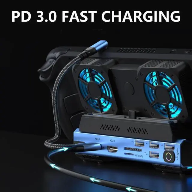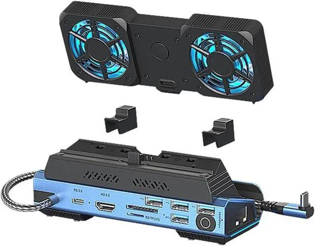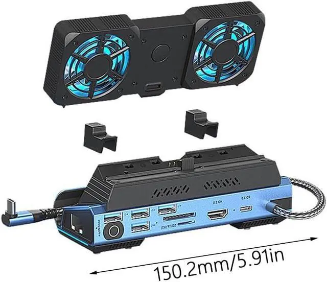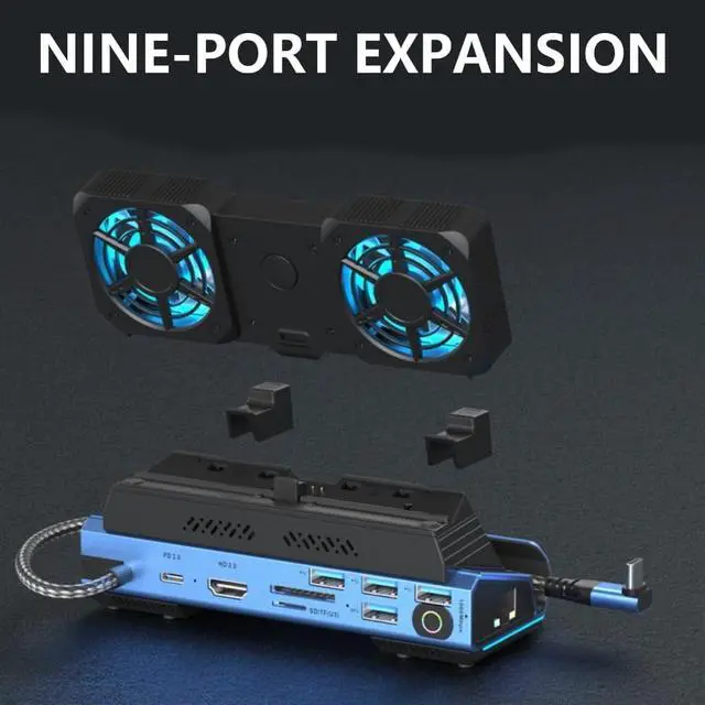 Elevates your gaming setups with this 9 in 1 docking station, featuring a detachable fan for cooling and connectivities.
