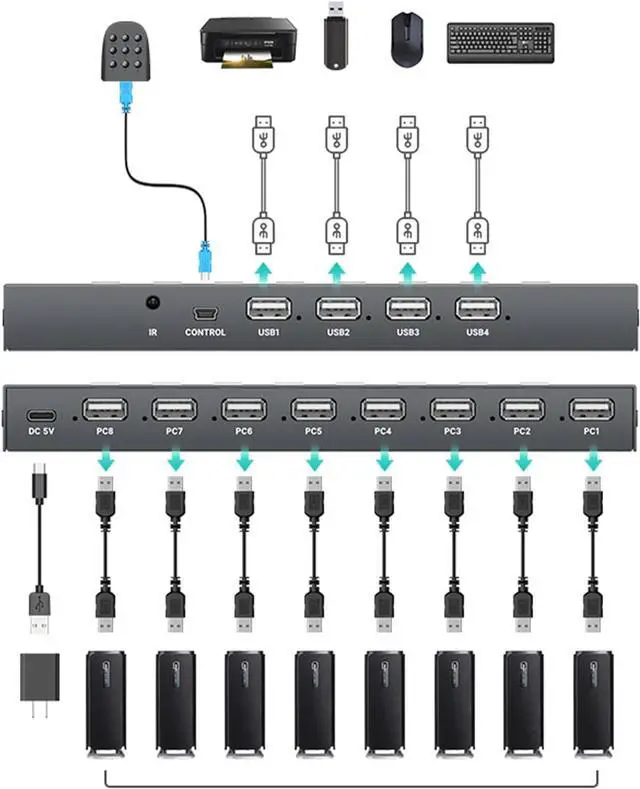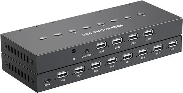 manage multiple devices with 8 in 4 out USB Switching Selector, allowing up to 8 computers to share a single set of peripherals such as a keyboards, and printer, enhancing productivity and efficiency