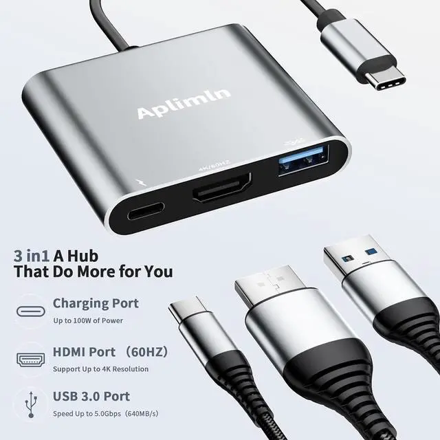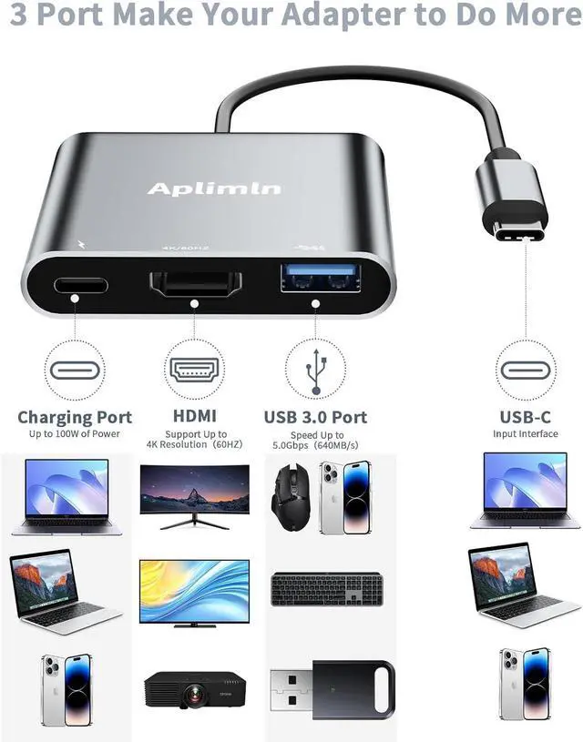 3-IN-1 USB-C to HDMI Adapter: Aplimln HDMI to USB C Adapter featuring a 4K@60Hz HDMI output, a 100W PD charging port, and a USB-A 3.0 port. Ideal for enhancing your home theater experience, optimizing office productivity, facilitating travel, and more.