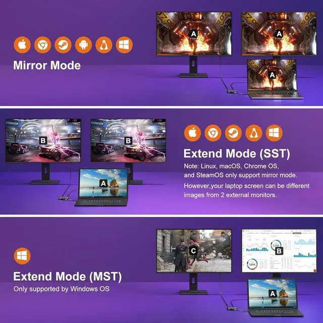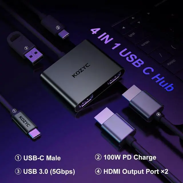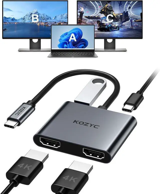 USB 3.0 to Dual HDMI Adapter This KOZYC USB-C adapter features 2x HDMI port, 1x USB 3.0 port, and 1x100W PD charging port, Note: Android system only supports AAA mode(mirror mode); macOS supports AAA, and ABB mode (does not support MST ABC mode); Windows OS supports AAA, ABB, ABA, and ABC mode.