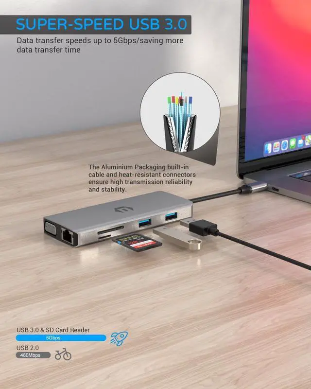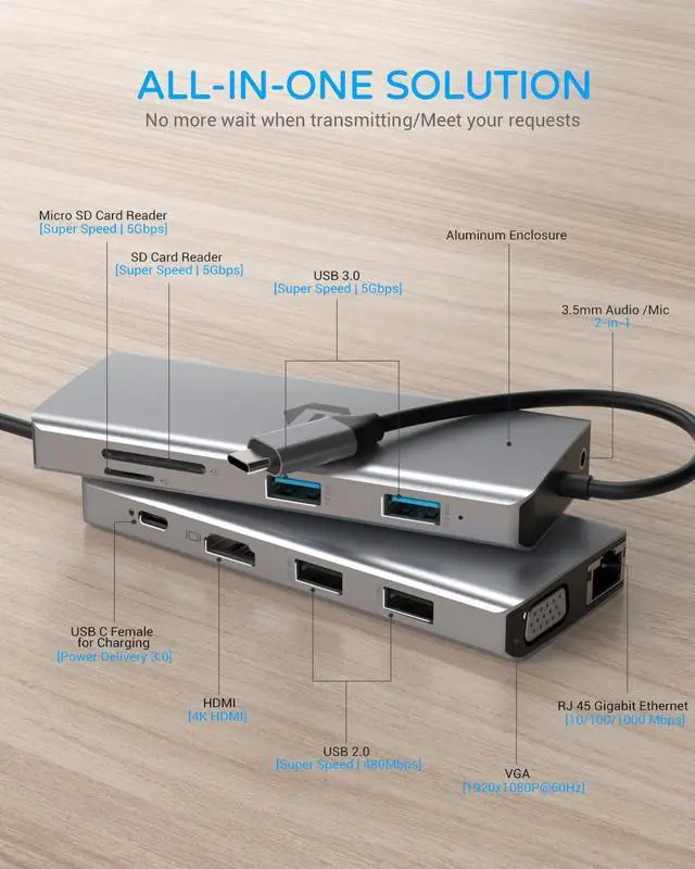 Extensive capability: The iTOTU 11-in-1 USB Type C hub offers a wide range of ports, including Ethernet/RJ-45 Port, Type C PD charging port, 2 USB 3.0 Ports, 2 USB 2.0 Ports, 4K HDMI video output, VGA, Micro SD & TF card reader. It also features a Mic/A