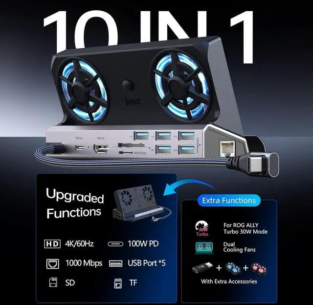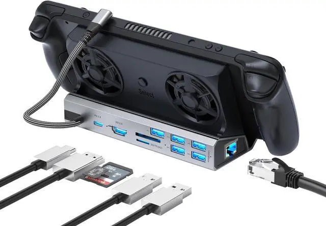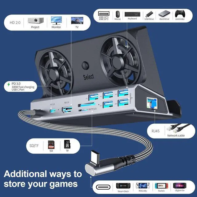 10 in-1 Handheld Console Dock:Transforms your Steam Deck OLED/ASUS ROG ALLY/Legion Go's USB Type-C into 10 ports: HDMI 2.0 (4K@60Hz), Gigabit Ethernet (1000Mbps),2 USB3.0 (5Gbps), 3 USB2.0,SD/TF, USB Type C PD 3.0 (100W),1 Key to change Screen,this handheld console dock combines hub, stand base,heat sink,40Gbps Type C adapter,4 Cpas,1 HDMI cord in 1.5M,it is a professional handheld gaming dock station.