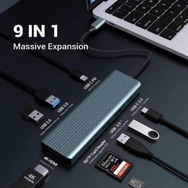 USB C Hub 9 in 1The 9 in 1 USB hub includes 1*4K HDMI, 2*USB 3.0 Type A, 1*USB-C Data Transfer Port, 2*USB 2.0 Type A, SD, TF, and 1*USB C PD, compatible for USB C laptops, mobile phones, pads and other devices. The hub can meet most needs of your daily work and life and can reduce the worry of insufficient ports.