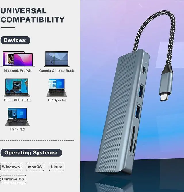 Wide CompatibilityThe slim and compact USB C hub is compatible with almost all Type-C and Type-A devices, and also supports operating systems such as Windows and Mac OS, which can reduce your worries about mismatching with your device, and scenario use is less restricted.