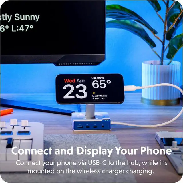 Connect and Display Your Phone Connect your phone via USB-C to the hub, whilst its mounted on the wireless charger charging.