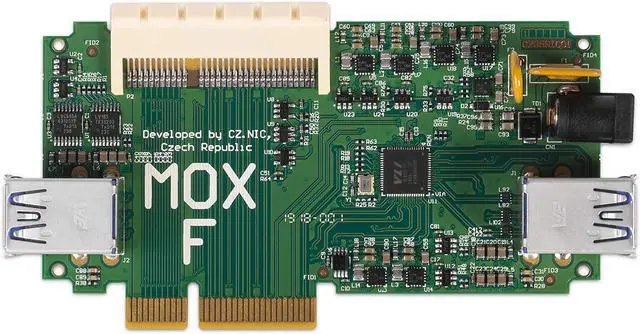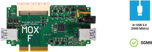 Turris MOX Secure Open Source Router Extension Module 4 USB 3.0 ports (up to 5Gbps) 1x 64-pin connector for connecting additional modules You can use it to connect external drivers, TV tuners and other devices. Via SGMII: YES, via PCIe: NO