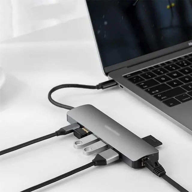 Support connection to 4K screen, USB3.0 theoretical transmission speed 5Gbps, SD/TF cardtransmission speed 480Mbps, interface transmission speed 40Gbps, maximum support 87W charging